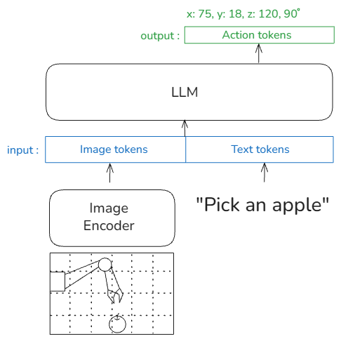 원리는 GPT와 ViT에 대해서 알고 있다면 어렵지 않게 이해할 수 있습니다. 그렇지만 여기서 액션 토큰은 뭘까요? 어떻게 로봇 팔의 좌표, 팔의 각도, 그립 등의 정보들을 토큰으로 변환할 수 있을까요?
