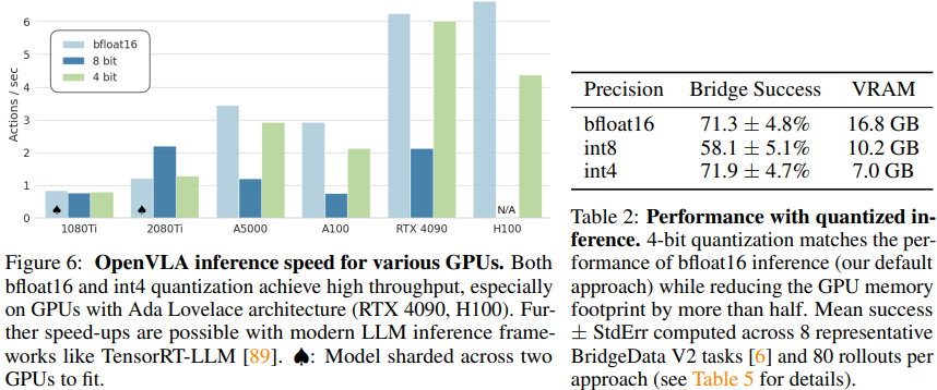 좌측의 그래프는 각 GPU별 inference 속도(1초당 수행 가능한 행동 수)를, 우측의 표는 양자화 기법을 사용했을 때 사용되는 VRAM의 크기와 모델 정확도입니다. 아직은 누구나 자유롭게 사용 가능할 정도까진 아닌 것 같지만 그래도 많이 완화된 것 같습니다.